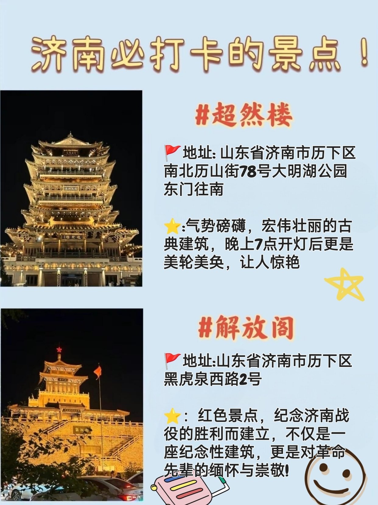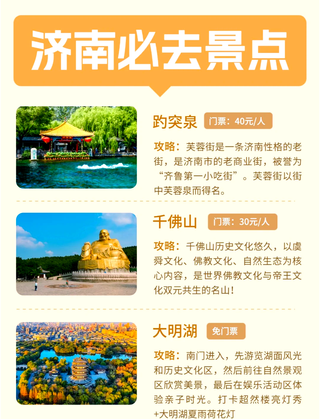 濟南作為一座歷史悠久的城市,擁有獨特的泉文化、自然風光和人文景觀,本文介紹的這些景點只是濟南眾多景點中的一部分,但足以讓您領(lǐng)略泉城的獨特魅力,無論是大明湖的湖光山色、千佛山的石刻藝術(shù)、泉城廣場的現(xiàn)代化建筑、五龍?zhí)豆珗@的古建筑與自然風光,還是黑虎泉的泉水特色、紅葉谷的生態(tài)美景、芙蓉街的歷史文化氛圍以及百花洲的賞花勝地,都足以讓您在濟南留下美好的回憶,希望您在游玩的過程中,能夠深入體驗泉城之美,感受濟南的獨特魅力。