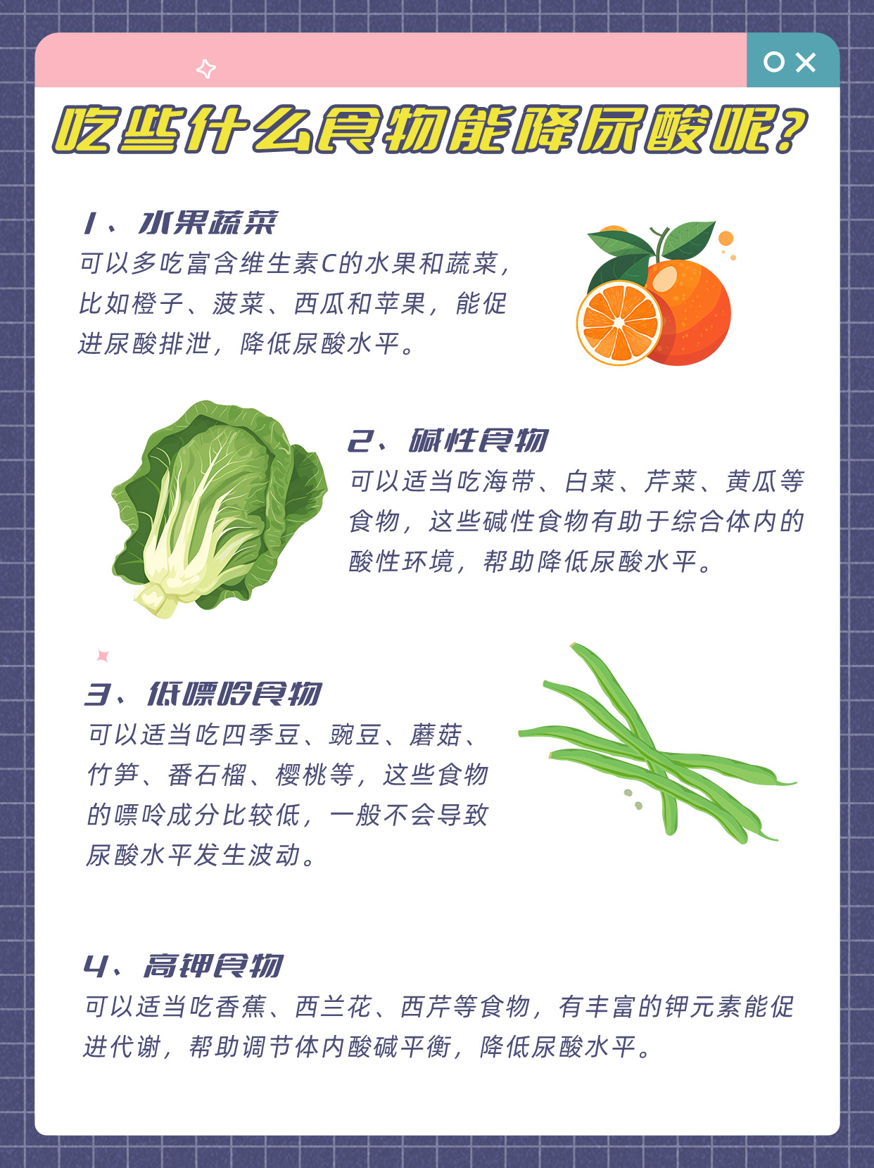 (1)奶制品:如牛奶、酸奶等,這些食物有助于降低體內(nèi)尿酸水平,研究表明,奶制品中的某些成分能夠促進(jìn)腎臟排泄尿酸。
