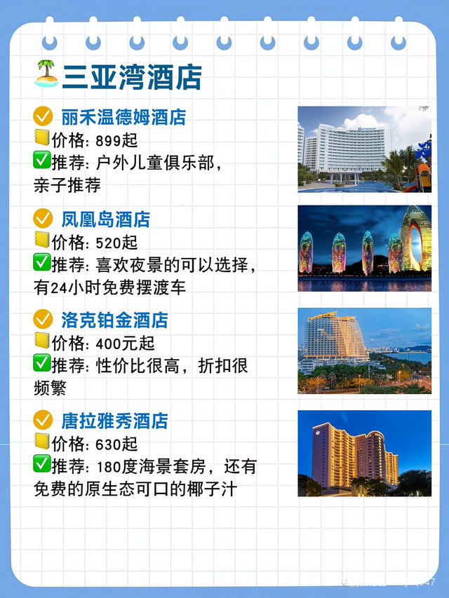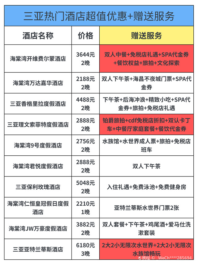 五星級(jí)房間:每晚800元至2500元人民幣不等,特色:熱帶花園、兒童俱樂部和豐富的水上活動(dòng),4. 三亞香格里拉度假酒店五星級(jí)房間:每晚1200元至3500元人民幣不等,特色:位于三亞灣,擁有私人海灘、豪華泳池和水療中心,5. 三亞亞龍灣鉑爾曼度假酒店五星級(jí)房間:每晚900元至3000元人民幣不等,特色:法式風(fēng)情度假酒店,提供多種餐飲選擇和水上樂園,6. 三亞亞龍灣熱帶天堂森林公園酒店五星級(jí)至七星級(jí)房間:每晚1500元至5000元人民幣不等特色:熱帶主題酒店,擁有叢林探險(xiǎn)、玻璃棧道等獨(dú)特體驗(yàn),7. 三亞亞龍灣人間天堂-鳥巢度假村五星級(jí)至八星級(jí)房間:每晚2000元至萬(wàn)元以上人民幣不等特色:獨(dú)特的鳥巢主題客房、懸崖餐廳和豐富的戶外探險(xiǎn)活動(dòng),8. 三亞灣紅樹林酒店五星級(jí)房間:每晚18元至人民幣不等特色:大型綜合度假勝地,擁有購(gòu)物中心、博物館等配套設(shè)施,價(jià)格根據(jù)房型和預(yù)訂時(shí)間有所變動(dòng),以上價(jià)格僅供參考,具體價(jià)格還需根據(jù)季節(jié)、預(yù)訂時(shí)間和房型進(jìn)行確認(rèn),在選擇酒店時(shí),請(qǐng)根據(jù)您的需求和預(yù)算進(jìn)行篩選,除了價(jià)格因素外,還可以關(guān)注酒店的設(shè)施、服務(wù)以及客戶評(píng)價(jià)等方面,建議您在預(yù)訂前查看酒店的官方網(wǎng)站或相關(guān)旅游平臺(tái)以獲取最新信息和優(yōu)惠活動(dòng),在享受三亞的美麗風(fēng)光的同時(shí),選擇合適的住宿將為您的旅程增添更多樂趣,無論是追求奢華體驗(yàn)還是經(jīng)濟(jì)型住宿的旅客都能找到適合自己的住宿選擇,希望這份三亞酒店價(jià)格表能夠幫助您規(guī)劃一次完美的熱帶度假旅行!在您的旅途中享受陽(yáng)光沙灘、美食文化以及獨(dú)特的熱帶風(fēng)情吧!